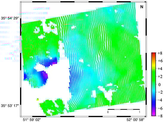 The SBAS time series was created to analyze the Lar Dam’s behavior. The LOS displacements were calculated using Sentinel-1A’s ascending orbits. The Sentinel-1 analysis from 5 February 2015 to 30 September 2019 shows a maximum mean LOS velocity of 8 mm/y away from the satellite in the LOS direction, on the left side of the dam (Figure 9).