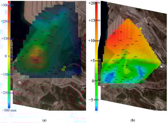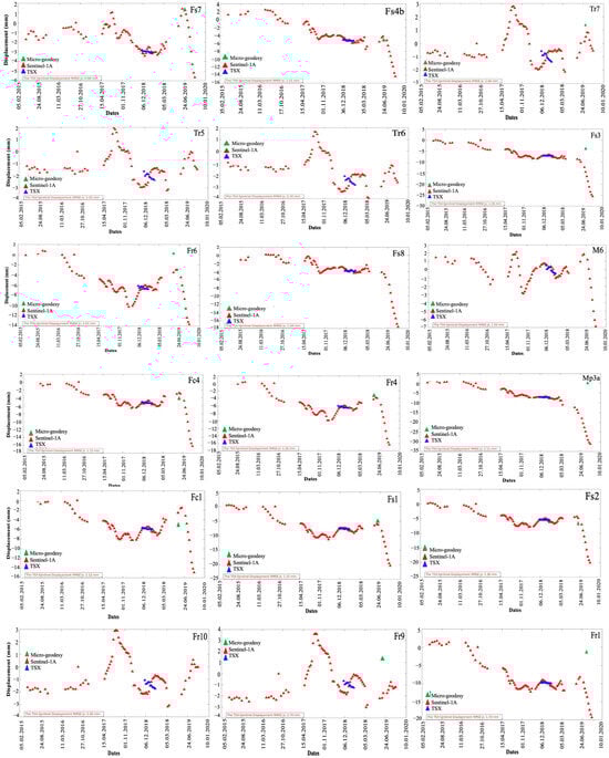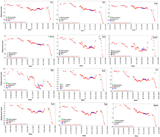 In addition, the vertical displacement between the Sentinel-1 and TerraSAR-X images was consistent. As shown in Figure 11, the minimum and highest RMSE values between the TerraSAR-X and Sentiel-1 images were 0.87 in TS13 and 2.70 in FR9, respectively.