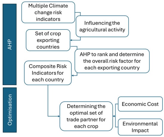 The methodology proposed in this study aims to enhance the resilience of the food import system in the face of climate risks affecting exporting countries. The suggested framework determines the optimal set of trade partners capable of meeting Qatar’s annual demand, as an importing nation, for three essential commodities: tomatoes, cucumbers, and onions, which are the most consumed crops in the nation. The framework is designed over two stages, wherein the initial step is to construct a composite risk factor that depicts the impact of climate change risks on the production of different crop-producing countries. The indicators selected consider multiple factors representing uncontrolled natural risks, such as surface temperature, arable land, water stress, and sea level, in addition to some monitored indicators representing the countries’ response to climate change, such as disaster risk management programs. The selection of these indicators is grounded in the recognition that the impact of climate change on irrigation is multifaceted and influenced by a variety of natural factors. These factors, including surface temperature, arable land availability, water stress, and sea level, collectively contribute to uncontrolled natural risks that can significantly affect irrigation systems. Additionally, the inclusion of monitored indicators, such as disaster risk management programs implemented by countries, reflects the proactive measures taken in response to climate change. By considering both the natural risks and the countries’ response strategies, a comprehensive assessment of the impact of climate change on irrigation can be obtained, providing valuable insights for effective planning and adaptation measures. The composite indicators for each trade partner are designed using the AHP method. The second stage of the methodology consists of optimizing the international supply system in charge of delivering tomatoes. The problem is formulated as a multi-objective optimization that minimizes the economic and environmental costs in addition to the exposure to climate risks of the selected trade network (Figure 1). A detailed description of the methodology is presented in the following sections, wherein Section 3.1 explains the AHP steps, and Section 3.2 illustrates the mathematical formulation of the optimization framework.