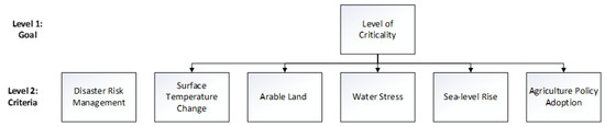 In this study, the AHP is meticulously applied to evaluate the climate change risk factors affecting agricultural sectors within seven countries: the United States of America, Iran, Lebanon, India, Turkey, Morocco, and the Netherlands. The focus is on three primary crops: tomatoes, cucumbers, and onions. This led to the creation of twenty-one composite indicators that encapsulate the risk profiles for the crop-producing sectors across these countries. For each country and crop combination, this study identifies six critical risk factors: disaster risk management, surface temperature change, arable land availability, water stress, sea level rise, and agricultural adaptation policies. This results in a comprehensive analysis involving 15 pairwise comparisons per set of risk factors, employing the equation 5, where n is the number of risk factors. To illustrate the process, an example of the pairwise comparison matrix used to assess the risk factors for tomato production in India is provided (Table 1). This methodology is consistently applied to all scenarios under investigation. Subsequent to the completion of pairwise comparisons, the study employs normalized eigenvalue approximation to derive priority vectors. This involves normalizing each value within the comparison matrix by the sum of its respective column, followed by averaging the normalized values across rows to yield a set of priority scores for each risk factor. The culmination of this phase is the synthesis of these priority scores into a singular, representative composite risk indicator for each crop–country pair. This aggregation is achieved through a weighted average calculation, where the lowest score is assigned a weight of 1 and the highest score receives a weight of 6, reflecting the relative significance of each risk factor [23]. The generated composite risk indicators serve as critical inputs into the optimization model detailed in the subsequent section, Section 3.2, providing a robust foundation for the strategic assessment and mitigation of climate change risks within the specified agricultural contexts. To aid in the understanding of the AHP methodology and its application in this context, a hierarchical diagram is provided, visually representing the decision-making framework, from the overarching goal down to the specific criteria considered (Figure 2).