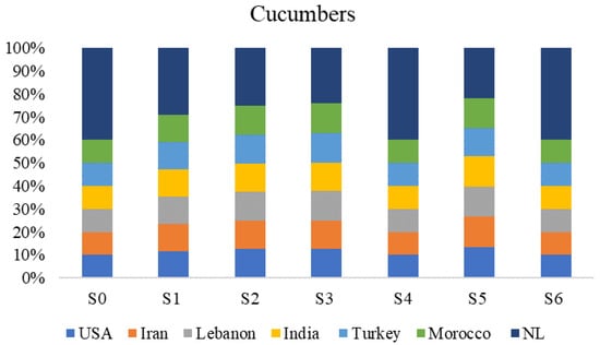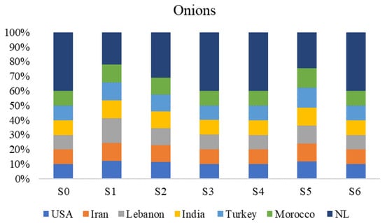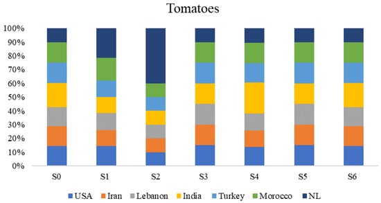 The multi-objective optimization model was used for three different crops in order to determine the optimal network of exporters. The results of the three optimizations are summarized in Figure 3, while Figure 4, Figure 5 and Figure 6 illustrate the average percentage contributions of each trading partner to the demands of tomatoes, onions, and cucumbers, respectively. Considering tomatoes, the optimal solution costs a total of USD 16 million and generates 60 tons of CO2eq, with an average risk of 10%. As for onions, the economic costs, environmental emissions, and risk factors are USD 6 million, 1 ton of CO2eq, and an average risk exposure of 11.8%, respectively. With regard to cucumbers, USD 10 million for the total supply cost, 42 tons of CO2eq for the environmental emissions, and similar risk factors.