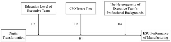The top management team shapes the company’s digital transformation strategy. Recent studies have shown that top managers are organizational change leaders, corporate strategy shapers, and business model innovators [6], and play a key role in digital transformation implementation. Certo et al. [27] found that the decision-making power of top managers affects the implementation and effectiveness of a company’s strategy. Firk et al. [28] and Sun et al. [29]’s empirical studies discussed that the quality of executive characteristics increases corporate social responsibility and improves ESG performance, but intense market competition and instability in the external environment exacerbate managerial, operational, and decision-making risks during digital transformation [22]. The literature [30,31] provides information about the direct positive effect of the executive team possessing resources of value, scarcity, inimitability, and irreplaceability on firms’ ESG performance, but the results of Xu et al. [32] indicate that the executive team with a high education level has a negative effect on ESG performance.
