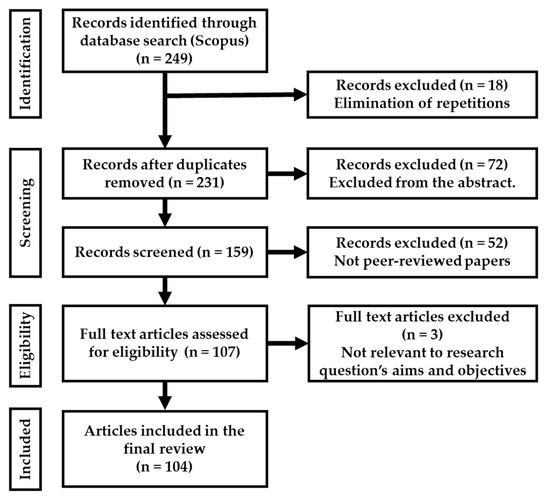 The methodology of this research was designed based on previous systematic reviews [24,27,30]. This study followed the PRISMA (Preferred Reporting Items for Systematic Reviews and Meta-Analyses) guidelines [31] (see Supplementary Materials). It is organized into several key phases, beginning with the formulation of the research question followed by the development and design of a detailed review protocol, outlining this review’s objectives, the criteria for study selection, and the strategies for data analysis. Subsequently, a comprehensive literature search was conducted in the Scopus database to gather relevant studies. The subsequent phase involved screening these studies to identify those pertinent to our research question, setting the stage for data extraction. This process facilitated the commencement of the analysis, aiming to synthesize the findings systematically [32].
