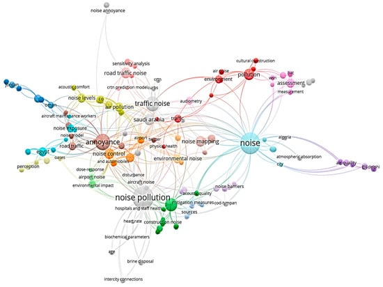 By analyzing the centrality and frequency of co-occurring keywords, a network graph was generated with forty-three nodes and six clusters using Vosviwer software (Figure 5). The results showed that “noise pollution” is the most commonly used keyword with 20 occurrences and a total link strength of 25, indicating a significant relationship with other relevant keywords like “road traffic noise” and “soundscape” cited only once in 2021. Furthermore, there was a noticeable presence of keywords associated with noise annoyance, such as “annoyance”, “noise”, and “noise annoyance”.