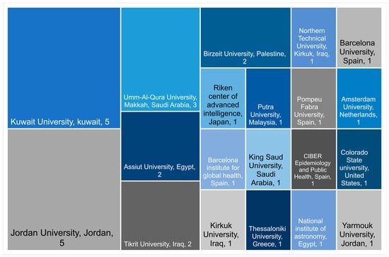 Research on noise pollution in the Arab world has been published by researchers from 181 institutions, including universities, laboratories, and research institutes, as illustrated in Figure 6. Analysis shows that there is no institution dedicated solely to noise pollution research in the Arab world. The number of articles published by the researchers of these institutions varies between one and five.