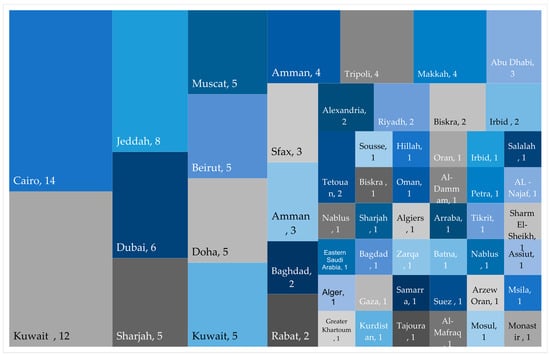 Figure 7 shows Arab cities studied for noise pollution. Kuwait is the most studied city in eleven studies, followed by Jeddah in eight studies and Cairo in five studies. The sound environment of these three cities seems to be the most studied in the Arab world. Additionally, other cities such as Amman, Makkah, Beirut, Sfax, Irbid, Baghdad, Riyadh, Abu Dhabi, Sharjah, Dubai, and Muscat were surveyed multiple times, three to four times each. However, there are also a number of cities which have been studied less often than those mentioned previously, such as Nablus, Salalah, Tripoli, Biskra, Oran, Khartoum, Doha, Tetouan, Oran, Irbid, Amman, Najaf, Algiers, Assiout and Samara, Baghdad, Mafraq, Sousse, Monastir, Tikrit, Mosul, Sharjah, Abu Dhabi, Dammam, and Kurdistan.