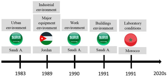 In the field of research on noise pollution in the Arab world, the chronological analysis of research topics reveals a trend towards broadening the scope of investigation over time. As illustrated in Figure 8, the early 1980s saw a focus on urban environment [38], with the addition of the two topics industrial environment and the major equipment environment in 1989 [43,44]. In the following years, research expanded to include work environment in 1990 and buildings environment in 1991 [45,46]. By 2000, laboratory conditions became a topic of investigation [47]. Overall, it is evident that research topics in noise have expanded over time, and it should be noted that the appearance of these research topics in certain countries does not necessarily guarantee their importance or significant presence in the field of research in those specific countries.