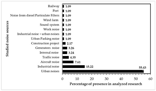 The data from this study show that urban noise, in particular traffic noise, was the most studied noise source in 55.43% of the studies conducted (see Figure 9), followed by industrial noise in 15.22%. Aircraft noise was studied in 7.61% of studies, and traffic noise was studied in 5.36% of studies. Other sources of noise such as indoor noise, generator noise, construction noise, and other noise sources were each investigated in less than three studies. Other sources of noise such as public broadcasting systems, wind farms, and harbors were each examined in only one study.