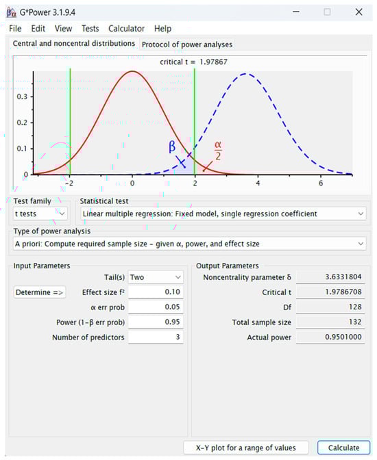 The sample size of this study was determined using Faul [55] latest version of (v.3.1.9.4). Using an alpha value of 0.05, a power of 0.95, an effect size of 0.15, and three predictors, the required sample size for this study was found to be 132 as shown in Figure 2. We used a convenience sampling technique for data collection because of its cost-effectiveness and time benefits, i.e., less time-consuming.