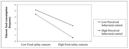 The moderating effect of perceived behavioral control on the relationship between food safety concern and take-out food consumption frequency.