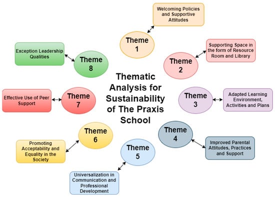 The thematic analysis of the transcripts provided by inclusive educators primarily centered on practices leading to the inception of an inclusive environment and enabling the study site’s long-term sustainability. To gain a thorough understanding of each text, the transcripts and field notes underwent several rounds of reading and revisiting. Data analysis involved open coding, following the methodology detailed by Strauss and Corbin (1998) [27]. Subsequently, themes were identified and presented within this study. Some of the themes generated are discussed below, followed by a Section 5.