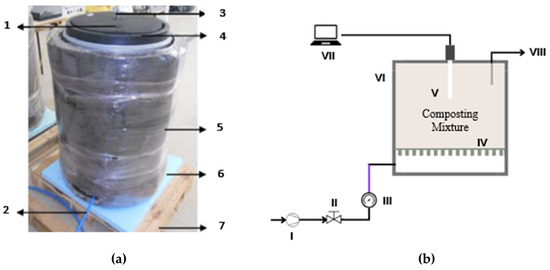 (a) The self-heating reactor used for laboratory composting and (b) schematic representation of the system associated with each SHR. LEGEND: 1—gas outlet; 2—air entrance; 3—opening for the temperature sensor; 4—SHR lid; 5—thermal insulation material (Aeroflex MSR); 6—extruded polystyrene foam; 7—wood pallet. I—air compressor; II—airflow valve; III—airflow meter; IV—perforated plate for airflow distribution at the bottom of the mixture; V—temperature sensor; VI—thermal insulation; VII—datalogger module; VIII—gas outlet from the composting mixture.