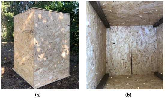 For the domestic composting experiments, a wooden composter was built, as shown in Figure 3, with a capacity of around 346 L. At the bottom of the vessel, an opening was made in the center to allow the drainage of the leachate eventually produced. A lid was placed on top of the composter to minimize the influence of variability of the ambient conditions (e.g., solar radiation and precipitation). To facilitate air circulation by natural convection, around 150 holes with 8 mm diameter were made on the sides of the composting container.