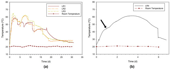 Temperature profiles for reactors (a) LR1, LR2, and LR3; (b) LR4 (the arrow ↓ indicates the moment when the reactor was completely filled).