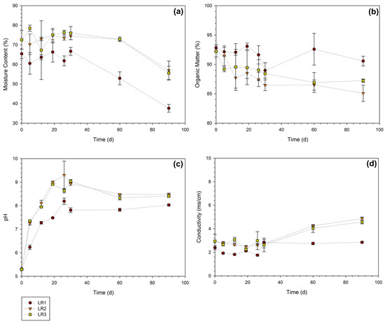According to Figure 5a, the MC profiles remained relatively constant during the time the mixtures were inside the SHRs, from day 1 to day 33. Mixture LR1 was characterized by an MC near 60%, whereas LR2 and LR3 contained between 70% and 80% due to the prevalence of CFW in their composition. As aforementioned, high MC in the mixture may hinder the flow of oxygen, thus favoring the appearance of anaerobic zones [34]. After the mixtures were removed from the reactors, the MC decreased due to evaporation loss to the surrounding environment. The OM content was quantified through volatile solids, and according to Figure 5b, this parameter remained above 85% for all samples analyzed, while at the beginning, the OM was around 92% in the three mixtures. The pH plays a crucial role in this process, as it provides information on the state of decomposition of the OM and influences the activity of the microorganisms [21]. Figure 5c shows that initially, the mixtures had a low pH (around 5), whereas as the composting progressed, it gradually increased. On the 90th day, the compost pH is in the range of 8–8.5, which reflects the process of maturation and stabilization of the materials [47]. Regarding the electrical conductivity (EC), Figure 5d shows a gradual evolution of this parameter over time. At the end of the process, the EC was 2.85 mS/cm for reactor LR1, 4.87 mS/cm for LR2, and 4.58 mS/cm for LR3. EC (related to salinity) is proportional to the concentration of ions present in the solution obtained by extracting the compost and is a common indicator of quality [48]. The salinity may play a role if a high load of compost is applied to the soil by hindering growth or the germination of seeds. The levels of EC measured in this study do not compromise its application since the criterion of quality commonly is that EC should be lower than 4–5 mS/cm [48].