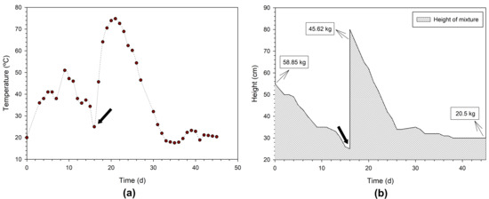 Monitoring of domestic composting: (a) temperature profile and (b) mixture height variation over time (the arrows ↓ indicate the moment of the second addition of biowaste to the composter).