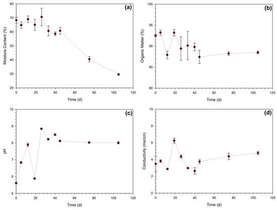 Evolution of parameters analyzed throughout the domestic composting process: (a) MC, (b) OM content, (c) pH, and (d) electrical conductivity.