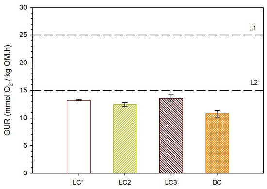 In this regard, respirometric tests were performed (following the standard EN 10687-1) to assess the biological stability of the final composts. Each sample was tested in duplicate, and the results of the pressure drop profile were consistent among them (Figure S4 in the Supplementary Information). From these data, the oxygen uptake rate at the end of the composting process (OURf) was calculated (dividing RA obtained through Equation (2) by 72 h) as mentioned in Section 2.3, and the results are summarized in Figure 8. It can be seen that the OUR values measured for all composts are in the range of 10.31 mmolO2/kgOM.h to 13.98 mmolO2/kgOM.h. Considering the limits established in standard EN 10687-1—for compost to be considered an organic fertilizer (limit L1–25 mmolO2/kgOM.h) or a soil improver (limit L2–15 mmolO2/kgOM.h), it can be concluded that all composts obtained in this study can be used for both specific purposes. Also, in the literature, it has been mentioned that if a compost presents an OURf below 15 mmolO2/kgOM.h it can be considered stable, as it provokes low consumption of oxygen [49]. Composting of other materials (e.g., pig manure and a variety of bulking agents) can start with an oxygen uptake rate in the range of 40–50 mmolO2/kgOM.h., while after 2 months of composting, there is a decrease to values below 15 mmolO2/kgOM.h, indicating “stability” of the final composts [50].