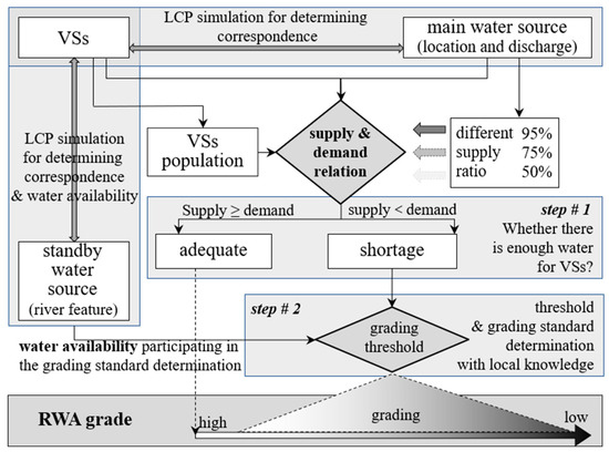 If the main water resource is not able to meet all the needs of these corresponding VSs in flat- or low-water periods, then the size of the demand gap and the water availability of the standby water source to the VSs were used to determine their RWA grades (Figure 3).
