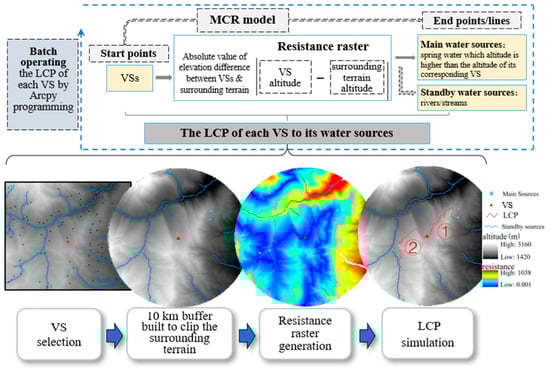 Firstly, a VS was chosen, and a 10 km circle buffer was generated to extract the surrounding terrain of the corresponding VS. The main or standby water sources in this circle would be the candidate water sources of the corresponding VS. Then, the resistance raster was generated to modulate the energy expenditure of individual movements in mountainous terrain. Next, with the Cost Distance module in ArcGIS, the LCP of the VS to its main or standby water source would be simulated. Last, the batch program was executed to loop all the VSs in the study area to obtain the LCP of all VSs (Figure 4, the below part).