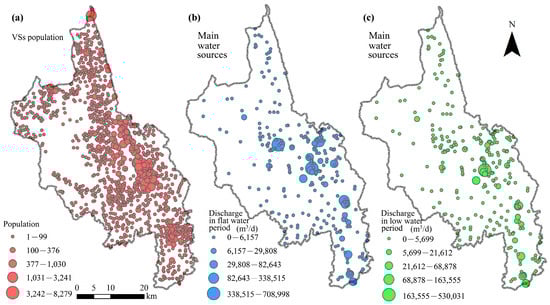 Population of the VSs (a) and discharges of the main water sources in flat-water period (b) and low-water period (c).