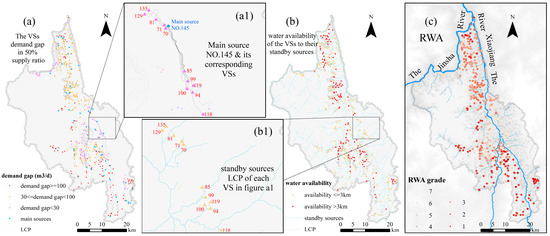 The RWA grade of VSs in low-water period. (a) The VSs demand gap in 50% supply ratio. (a1) Main source NO.145 & its corresponding VSs. (b) Water availability of the VSs to their standby sources. (b1) Standby sources LCP of each VS in figure (a1). (c) The RWA grade of VSs in low-water period.