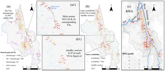 The RWA grade of VSs in flat-water period. (a) The VSs demand gap in 50% supply ratio. (a1) Main source NO.145 & its corresponding VSs. (b) Water availability of the VSs to their standby sources. (b1) Standby sources LCP of each VS in figure (a1). (c) The RWA grade of VSs in flat-water period.