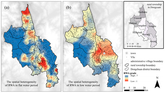 The spatial heterogeneity of RWA in Dongchuan. (a) The spatial heterogeneity of RWA in flat water period. (b) The spatial heterogeneity of RWA in low water period.