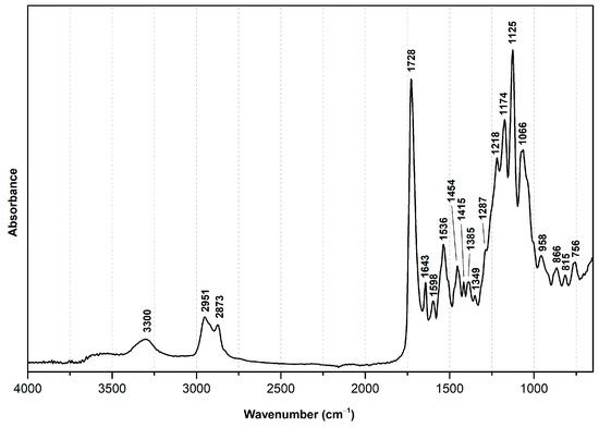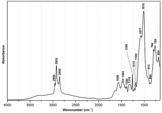 ATR-FTIR spectroscopy was performed using an Agilent Handheld 4300 (Agilent, Santa Clara, CA, USA) equipped with a ZnSe beam splitter, a Michelson interferometer, and a thermoelectrically cooled DTGS detector coupled to a diamond ATR sample interface. The spectra were acquired between 4000 and 650 cm−1, with a resolution of 8 cm−1 and 32 scans, and OriginPro 8 software (OriginLab Corporation, Northampton, MA, USA) was used for spectral interpretation. All spectra are presented as acquired, without baseline corrections or other processing.