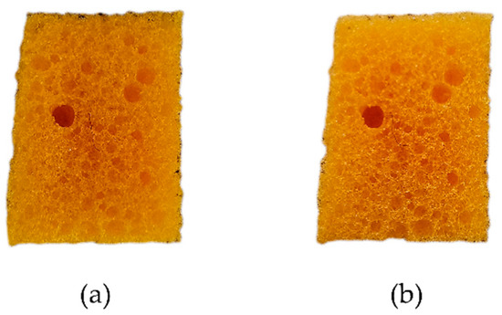 Ester-based PUR sample (a) before and (b) after scCO2-assisted consolidation (measuring approximately 15 mm × 10 mm × 10 mm). No differences were detected after treatment.