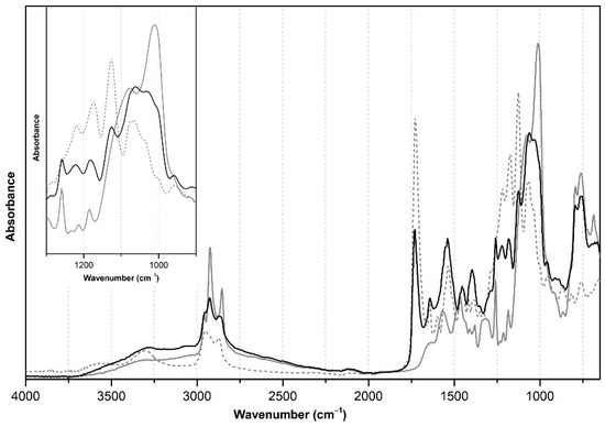 ATR-FTIR spectra of the degraded ester-based PUR foam surface (dashed grey line); APDEMS/OTMS reference film (grey solid line); and scCO2-assisted consolidated foam (black solid line). Inset: Detail of the region from 1300 to 900 cm−1.