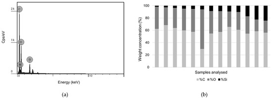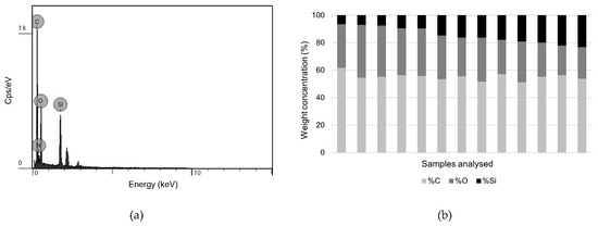 (a) SEM-EDS spectrum of the spray-consolidated sample. Concentration by weight: 55.0% of carbon (C), 36.6% of oxygen (O), and 8.4% of silicon (Si)—29,796 counts in 22 s (1305 c/s). (b) Graph exhibiting the weight concentrations of the elements present in some samples analysed by SEM-EDS: light grey represents carbon (% C), dark grey represents oxygen (% O), and black represents silicon (% Si).
