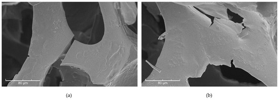 In Figure 5, two samples are displayed: a degraded reference sample (a) and a representative sample treated using scCO2-assisted consolidation (b). Comparing the cell surface of both samples, the non-consolidated sample exhibits a smooth and uniform surface with a collapsed and weakened structure, whilst the treated sample reveals a clearly distinct topography and a reinforced structure. A more textured surface is identified as well as a film deposited on the foam’s surface and surrounding the cell struts while the cell window remains open.