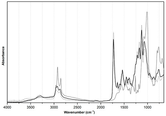 ATR-FTIR absorbance spectra of degraded, ester-based PUR foam (dashed grey line); APDEMS/OTMS reference film (grey solid line); and spray-consolidated foam (black solid line).