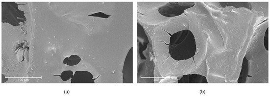 SEM images of (a) a weakened cell structure of a degraded ester-based PUR foam without consolidation and (b) a reinforced cell structure after scCO2-assisted consolidation at a magnification of 400×.