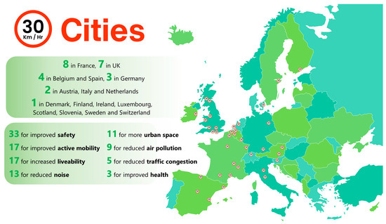 - The Connexion. 30 kph limit for Strasbourg. 2017. Available online: https://www.connexionfrance.com/article/Archive/30kph-limit-for-Strasbourg (accessed on 26 November 2023).