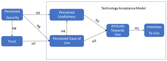 Overall, the Technology Acceptance Model has proven to be a valid and reliable model for explaining the acceptance and use of information systems and technologies. Its application has been expanded to various technologies, including blockchain-based e-voting and has helped researchers and practitioners to better understand the factors that influence user acceptance and adoption of new technologies [64]. Accepting blockchain technology is complex, and relying solely on the TAM model may provide a partial solution. Therefore, combining the TAM model with other relevant constructs is recommended to better understand a contemporary blockchain-compatible model [27]. The model can become stronger with external variables used to support the core constructs of TAM. These external variables reflect individual variances, situational constraints, and predictable management actions [63], and additional variables would assist in obtaining better effects [27]. The researchers expanded upon the foundational TAM model, integrating perceived usefulness (PU), perceived ease of use (PEoU), attitude towards use, and intention to use, with the addition of the external variable of trust and a new construct termed perceived security. This new construct explains the primary security attributes of blockchain-based e-voting systems, aligning with the objectives of this study (Figure 4).