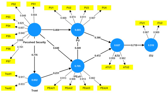 This approach is esteemed for its superiority over alternative techniques such as cross loadings and Fornell–Larcker measurements, offering a thorough assessment of the differentiation among latent constructs. Scholars typically recommend that the HTMT ratio fall within the range of 0.85 to 0.9; if the ratio surpasses 0.9, it suggests an excessive similarity between constructs, indicating a lack of differentiation [74,80]. Only the perceived security and trust coefficient is slightly greater than the recommended value, and this means that these two constructs are a little bit closer (Figure 5).