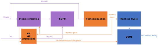 The objective of this study is to simulate a SOFC-RC-CCUS hybrid system that utilises biogas whose flowrate is approximated from the operating data of a real biogas plant. For this purpose, computer simulations using Aspen Plus V12.1 software were conducted. The system aims to assess the feasibility of fully utilising generated waste heat of high SOFC operating temperatures, enabling utilisation of hot exhaust gases for additional power production [35] in a modified RC, while also fully integrating the process. After heat utilisation, vacuum swing adsorption is used to capture CO2 from exhaust gases, which is then compressed, liquefied, and stored, while the generated heat from this process is used to generate sanitary hot water. Carbon capture contributes to sustainability of the system, which also comes directly from the choice of sustainable biogas as a fuel [47]. The fuel has an advantage over the fossil fuel-powered SOFCs. Although fossil fuels have a negative impact on the environment due to their carbon emissions, their use in SOFCs can reduce emissions [41], as fuel cells are more efficient in producing electricity compared to conventional power generation methods [35]. SOFCs produce less SOx and CO2 emissions compared to traditional combustion methods, while SOFC plants have higher efficiency and lower emissions compared to other fossil-fuelled energy systems [19].