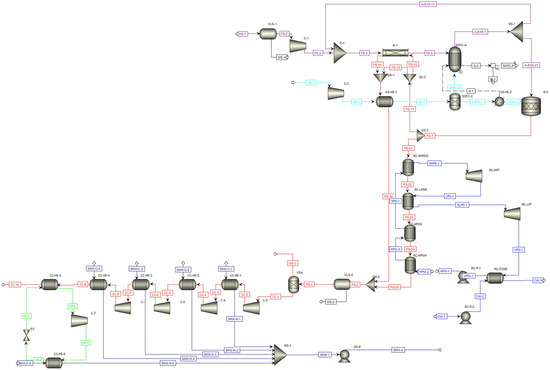 Aspen Plus flowsheet of the proposed process scheme. The different stream colours represent the fresh and exhausted fuel (purple), air and depleted air (turquoise), flue gases and captured CO2 (red), water in RC (blue), hot water for domestic use (dark blue), and refrigerant R717 cycle (green).