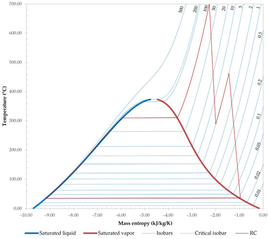 Temperature–entropy diagram of the RC, generated with Aspen Plus V12.1, used in simulations. The numbers beside the isobars represent the pressure of the corresponding isobar in bar.