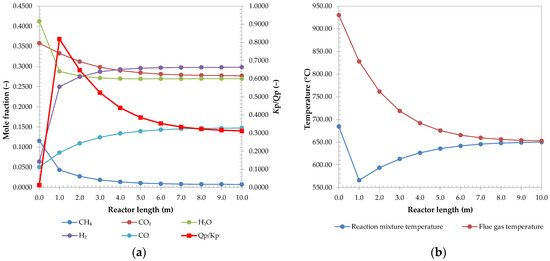 The model was used in a plug–flow reactor (PFR), modelled in a co-current flow with reactants and combustion products of R-2, where the combustion flue gases supply the heat to the PFR. In a reactor, a constant overall heat transfer coefficient of 20 W/(m2K) was assumed from a study [66]. The density of the catalyst and porosity were set to 2179 kg/m3 and 0.39, respectively, according to [53]. The reactor’s length, number of tubes, and their diameter were set to be 10 m, 500, and 0.1 m, respectively. The dimensions were chosen arbitrarily, so that the reaction mixture reaches equilibrium at a specified temperature of the SOFC anode inlet. For simplicity reasons, this temperature is denoted as reformer operating temperature. The temperature is reached with a design specification that varies the split fraction of stream FG-12 in a stream splitter SS-2.