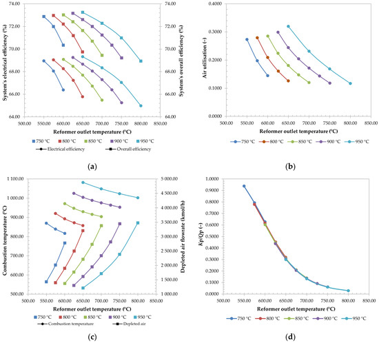 After the base case, the simulation was carried out at different operating parameters. In the first sensitivity analysis, the effect of the reformer operating temperature at different SOFC operating temperatures was investigated, as shown in Table 2. For the analysis, the S/C ratio and fuel utilisation were kept constant at 2.5 and 0.70, respectively.