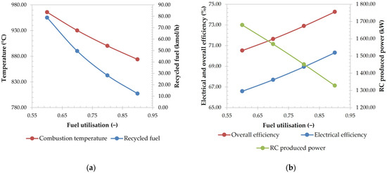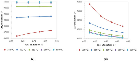 In the second analysis, the effect of fuel utilisation was investigated, at various SOFCs. Fuel utilisation was varied between 0.60 and 0.90 with a step of 0.10. The investigated SOFC/reformer operating temperatures were 750 °C/550 °C, 800 °C/600 °C, 850 °C/650 °C, 900 °C/700 °C, and 950 °C/750 °C. The S/C ratio was kept constant at 2.5.
