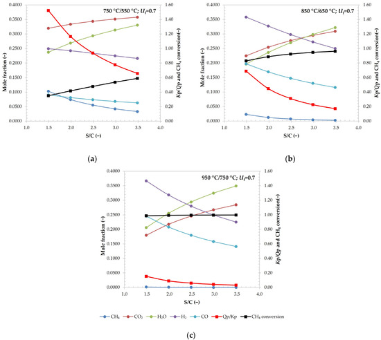 To assess the danger of coking, the ratio Kp/Qp was calculated. If the ratio is higher than 1 (Kp > Qp), it is considered that the equilibrium is shifted towards products [71], and therefore carbon formation, while the values below 1 (Kp < Qp) indicate that the equilibrium is shifted towards reactants [71], and coking would therefore not be present.