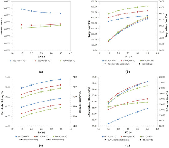 The third analysis was conducted while varying the S/C ratio between 1.5 and 3.5 with a step of 0.5, for the selected SOFC/reformer temperatures of 750 °C/550 °C, 850 °C/650 °C, and 950 °C/750 °C, to cover the SOFC and reformer operating temperature range. In this analysis, the fuel utilisation was constant, with a value of 0.70.