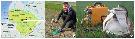 During the growing season, spring wheat (Triticum aestivum L.) was grown in 2018 (4 April 2018 (BBCH 0); 8 May 2018 (BBCH 12–13); 28 May 2018 (BBCH 33); 27 June 2018 (BBCH 75–77); 25 July 2018 (BBCH 87–89); 3 August 2018 (BBCH 97–99)). Two types of natural land use were investigated: grassland and forest (more details in Kochiieru et al. [4]).