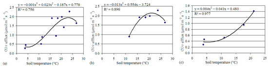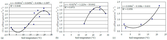 In the forest, the relationship between CO2 efflux and soil temperature can be described by multiple regression models: y = −0.001x3 + 0.023x2 − 0.187x + 0.778; R2 = 0.756, p < 0.05 (at the measurement period, Figure 5a), y = −0.013x2 + 0.554x − 3.724; R2 = 0.896, p < 0.01 (at the growing season, Figure 5b), and y = 0.004x2 − 0.043x + 0.480; R2 = 0.977, p < 0.01 (at the non-growing season, Figure 5c).
