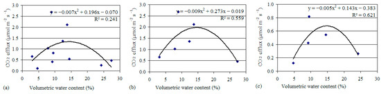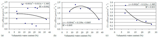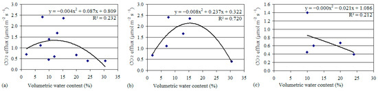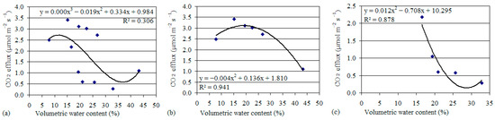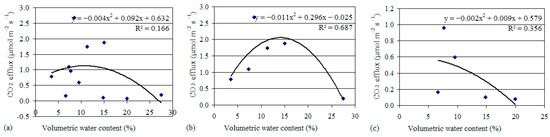 In the forest, the relationship between CO2 efflux and volumetric water content can be described by simple multiple regression models: y = −0.001x2 + 0.011x + 1.360; R2 = 0.042, p > 0.05 (at the measurement period, Figure 10a), y = −0.004x2 + 0.139x + 0.865; R2 = 0.895, p < 0.01 (at the growing season, Figure 10b), and y = 0.002x2 − 0.123x + 1.985; R2 = 0.833, p < 0.01 (at the non-growing season, Figure 10c).