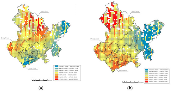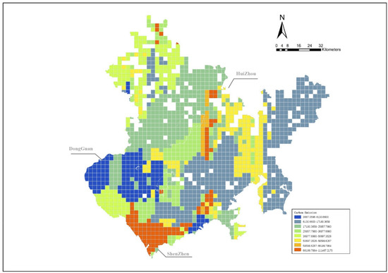 The distribution of carbon emissions is shown in Figure 2. Most of the high carbon emission regions of the three cities are located in peripheral areas, and the carbon emissions in the central areas are generally lower than those in the peripheral areas [33].